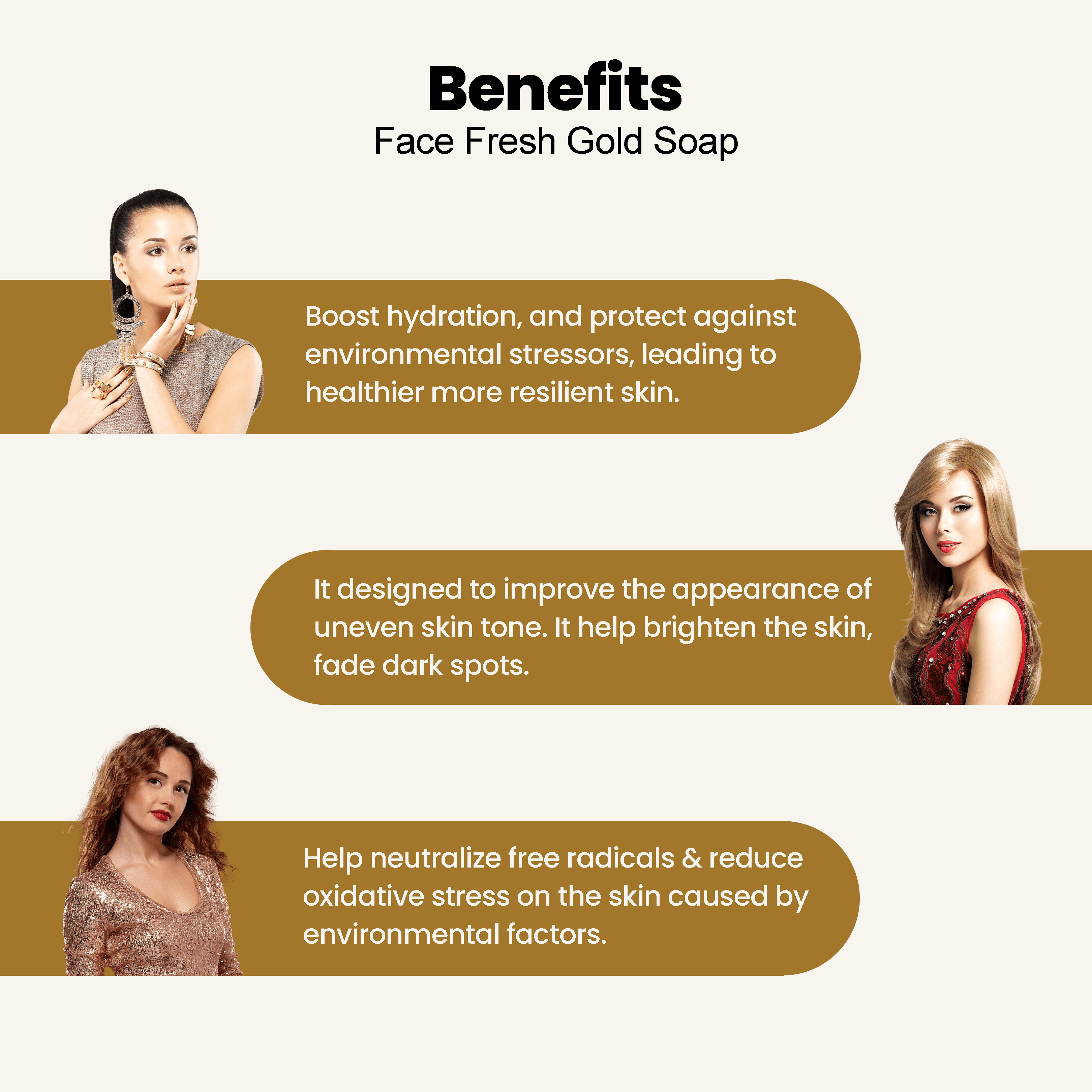 Face Fresh Gold Plus Beauty Soap is created with a combination of components including surfactants, which benefits to lift and eliminate dirt and scars from the skin and gives you clear and acne free skin. It also has the qualities of Face Fresh Gold Plus Beauty Cream with advanced formula and its regular use gives you a glowing, beautiful and flawless skin.
